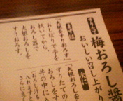 2009/04/17 Category : 携帯 すりたて 晩ご飯に○亀製麺のうどん食べに来ましたよ。新メニュー?期間限定メニュー?なんしか、看板の「すりたて・梅おろし醤油うどん」の文字に、梅・おろし好きとしては食べないわけにはいかんだろう、と……まさか「すりたて」が食べる時に自分ですりおろすンだとはっ!剥き身の大根と卸し器がついてきましたよ(笑)美味かったv PR Comment0 Comment Comment Form お名前name タイトルtitle メールアドレスmail address URLurl コメントcomment パスワードpassword